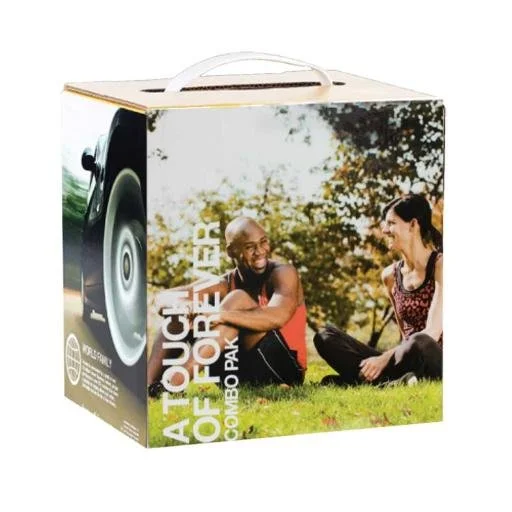 A modern wooden house is situated on a grassy hill with tall, reddish-brown grass. Several small trees are in front of the house. In the background, there is a large body of water with mountains and clouds behind it, under a soft pastel sky.
